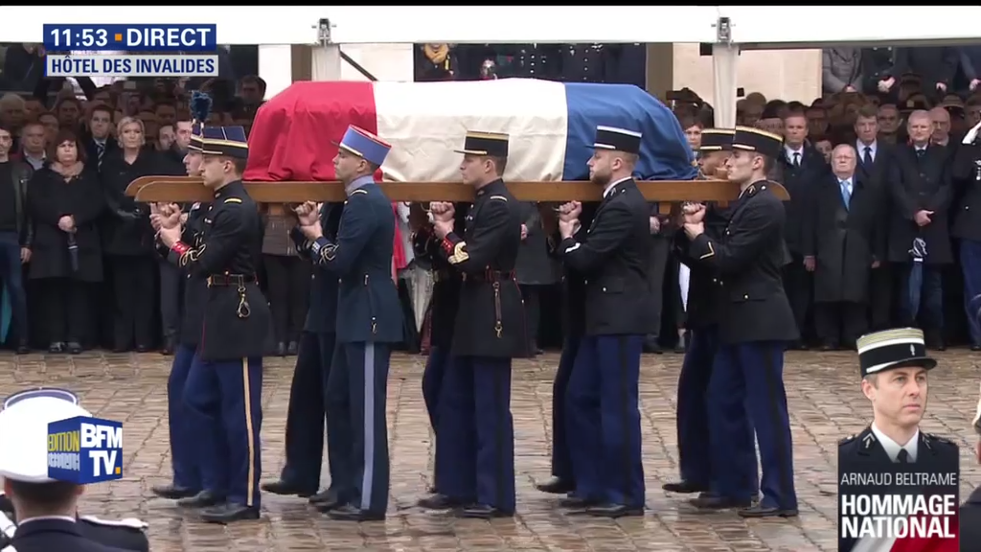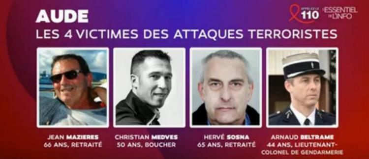 La présidence de la République annonce dès le 24 mars 2018 qu'un hommage national sera rendu au lieutenant-colonel Beltrame, dont le ministre de l'Intérieur Gérard Collomb rappelle la bravoure et l'héroïsme.