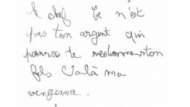 Lettre anonyme par laquelle un « corbeau » revendique le crimeJ'espère que tu mourras de chagrin le chef Ce n'est pas ton argent qui pourra te redonner ton fils Voilà ma vengeance. pauvre con