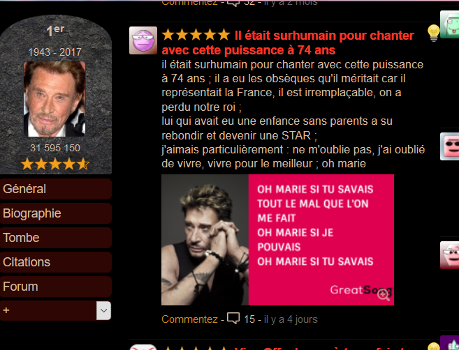 Johnnydj bonjour tout le monde! j'ai reprit le travail donc un peut moin de temps de mettre des coms! demain cela fera deja 2mois que johnny est partis avec les anges!! on continu a voter en masses les fans!! bonne soirée a toute et tous!