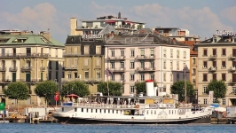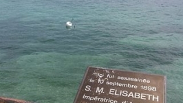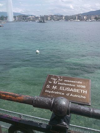Plaque commémorative du meurtre d'Élisabeth d’Autriche à Genève. En troisième plan le jet d'eau de Genève.